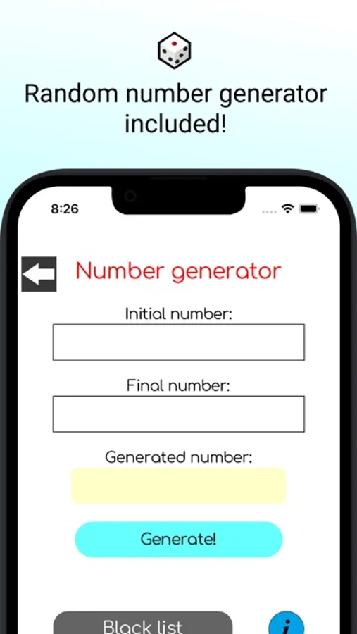 to generate random numbers, just enter the initial number and the final number. It is also available a convenient "blacklist", which allows you to exclude some numbers from the draw.