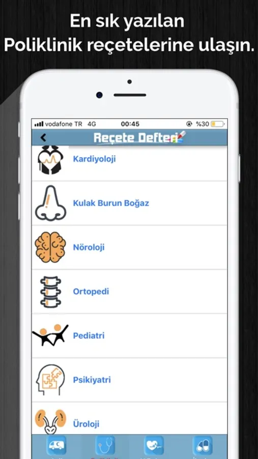 *Dermatoloji (resimli) - Dahiliye - Kardiyoloji (resimli) - Kalp ve Damar Cerrahisi - Çocuk Psikiyatrisi - Psikiyatri - Genel Cerrahi - Enfeksiyon - Fizik Tedavi - Pediatri - Kadın Doğum - Kulak Burun Boğaz -Nöroloji - Ortopedi - Üroloji (15 bölüm) poliklinik bölümleri içerisinde hastalıklar ve reçeteler yer almaktadır.