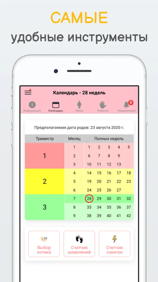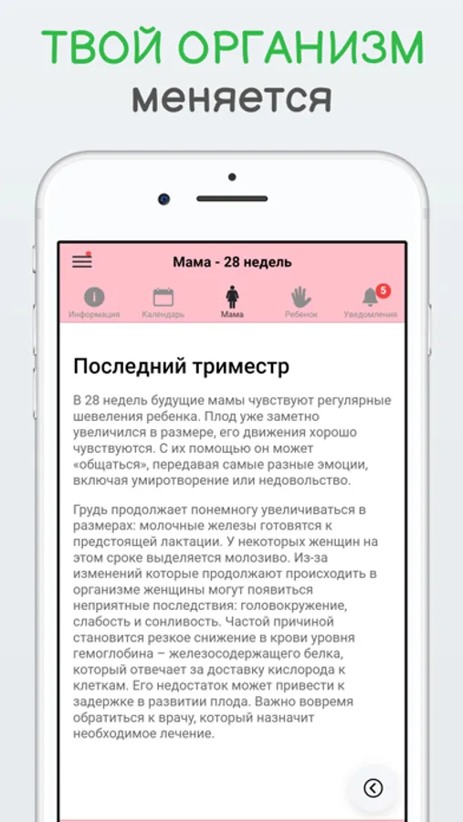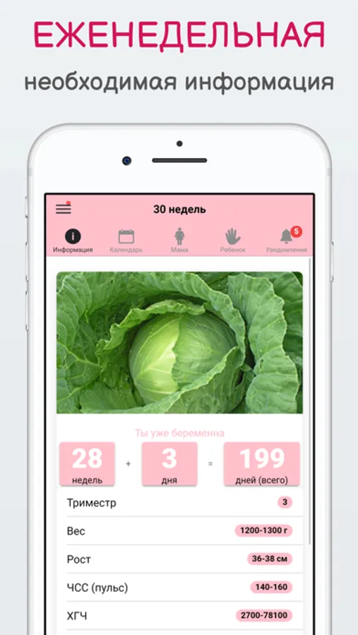 Беременность по неделям очень удобное и полезное приложение для будущих мамочек. Календарь беременности поможет вам узнать, как развивается Ваш малыш во время беременности. В приложении понедельно расписано состояние мамы и на что стоит обращать внимание на данном сроке. В календаре беременности вся информация разбита по неделям.