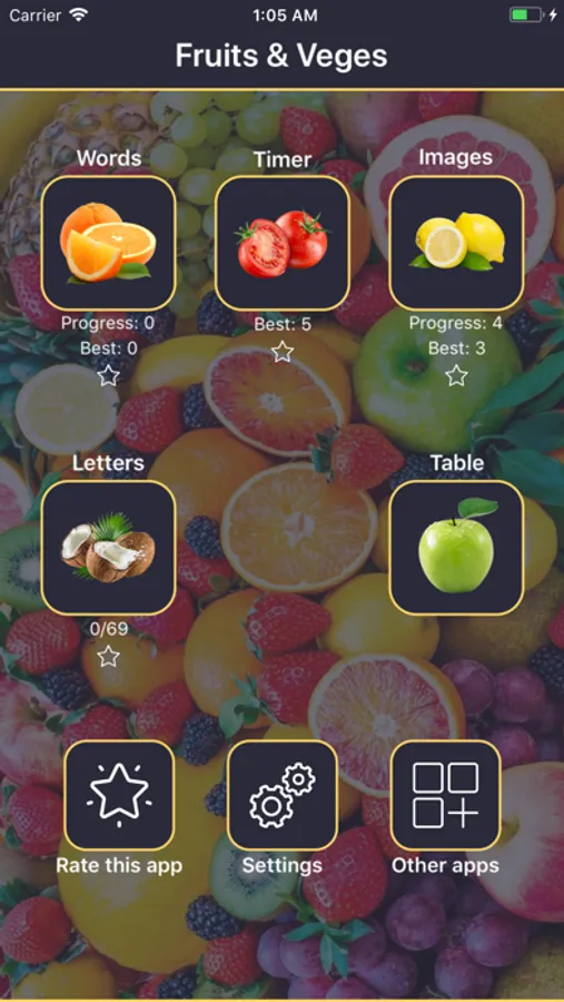 The game also contains a table with pictures and names of all fruits and vegetables.