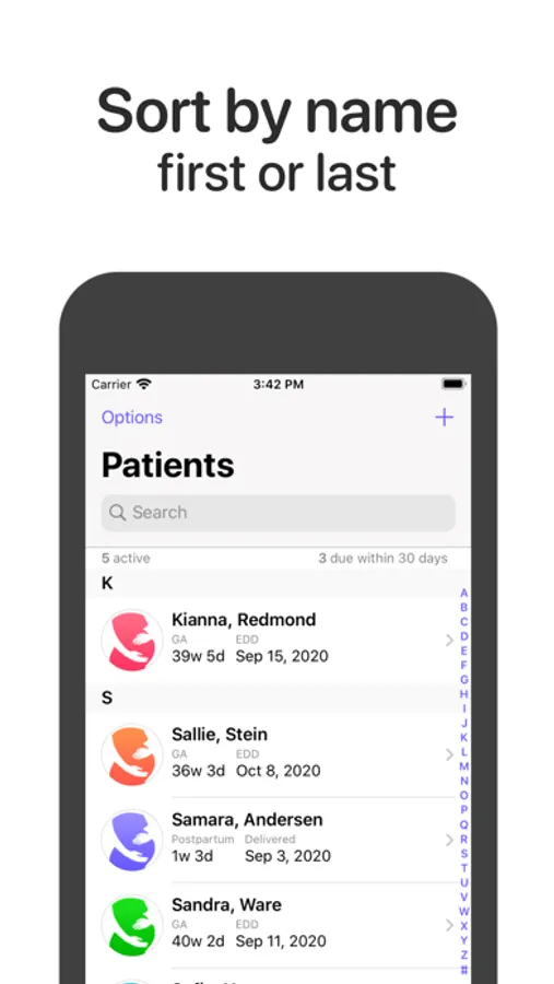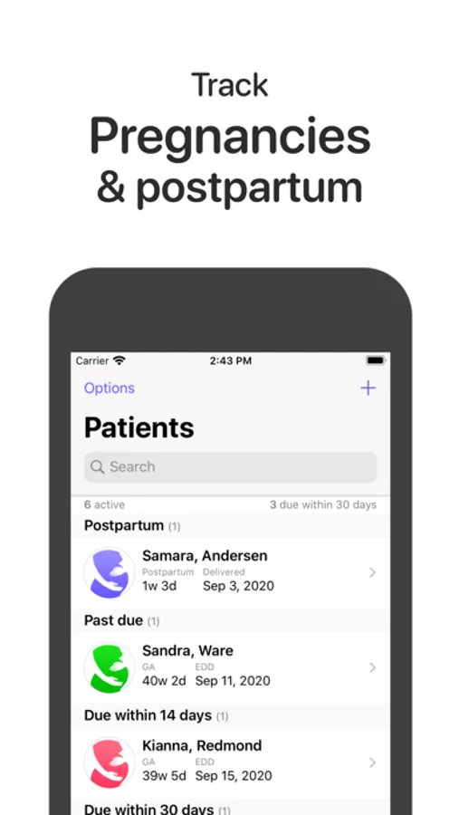 • Quick reference of upcoming, past-due, and postpartum patients.