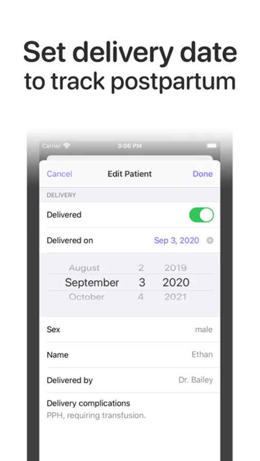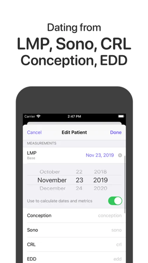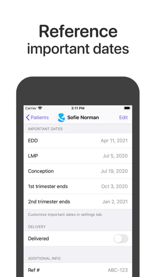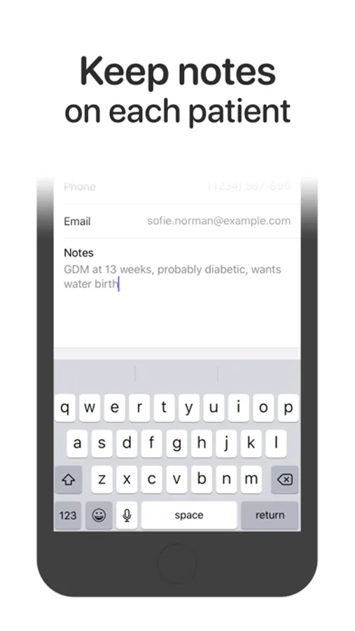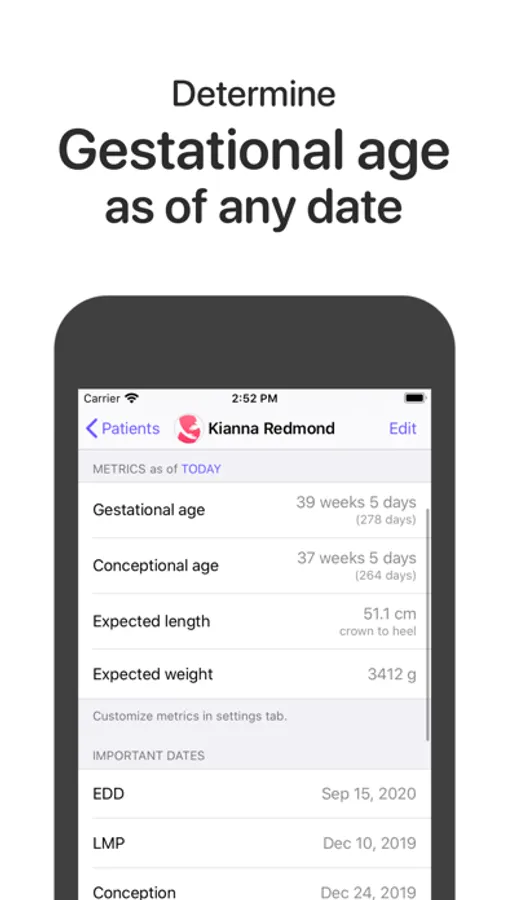 • Full details of each patient, including fully customizable metrics and important dates such as expected length/weight, trimester start/end, etc.