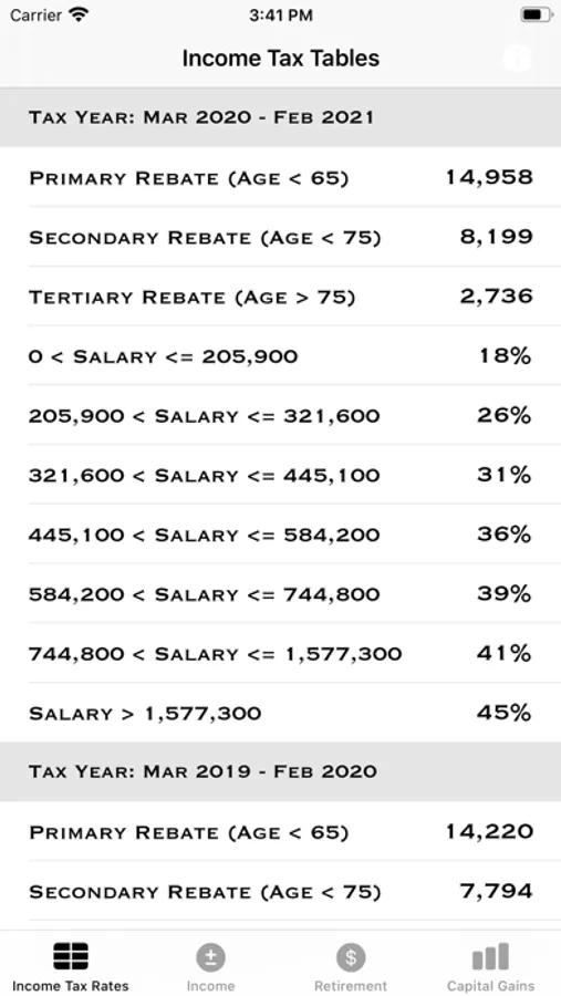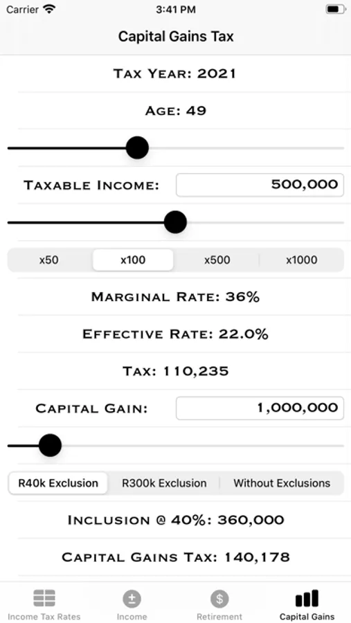 It also allows you to calculate capital gains tax, dependent on your marginal rate (which depends on your taxable income), under three different exclusions (none, R40k which is the annual rate, and R300k which is the rate on death).