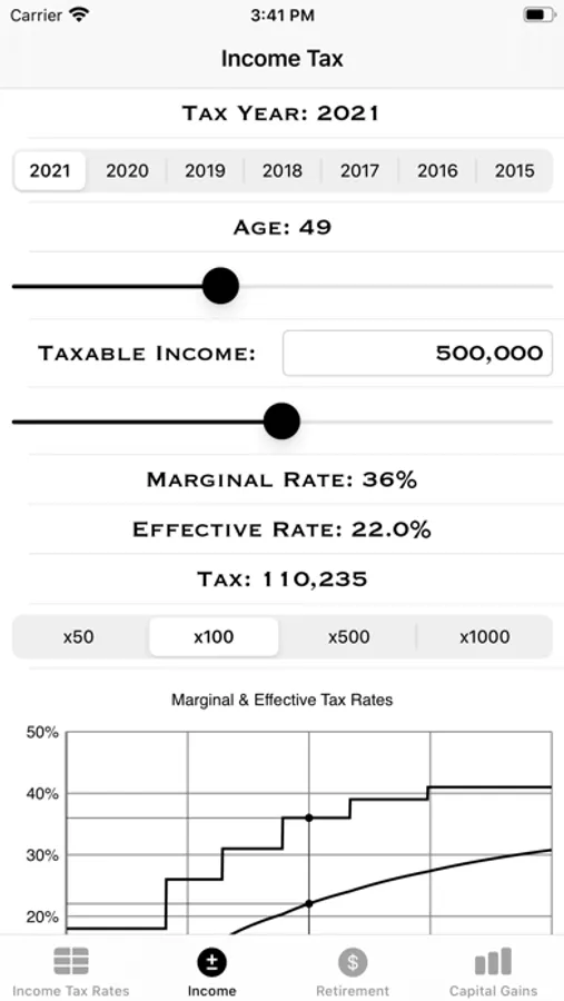 It allows you to calculate your marginal and effective tax rates, as well as the tax amount, depending on your taxable income and age, and shows you these graphically so that you can appreciate how these change with taxable income. You can select from the previous six tax years as well, to compare how rates have changed over the years.