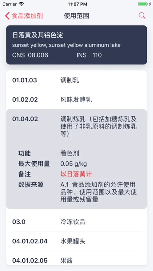 这里列出了2760及其增补中收录的添加剂清单,在这里可以快速访问、查找某个添加剂的使用范围。