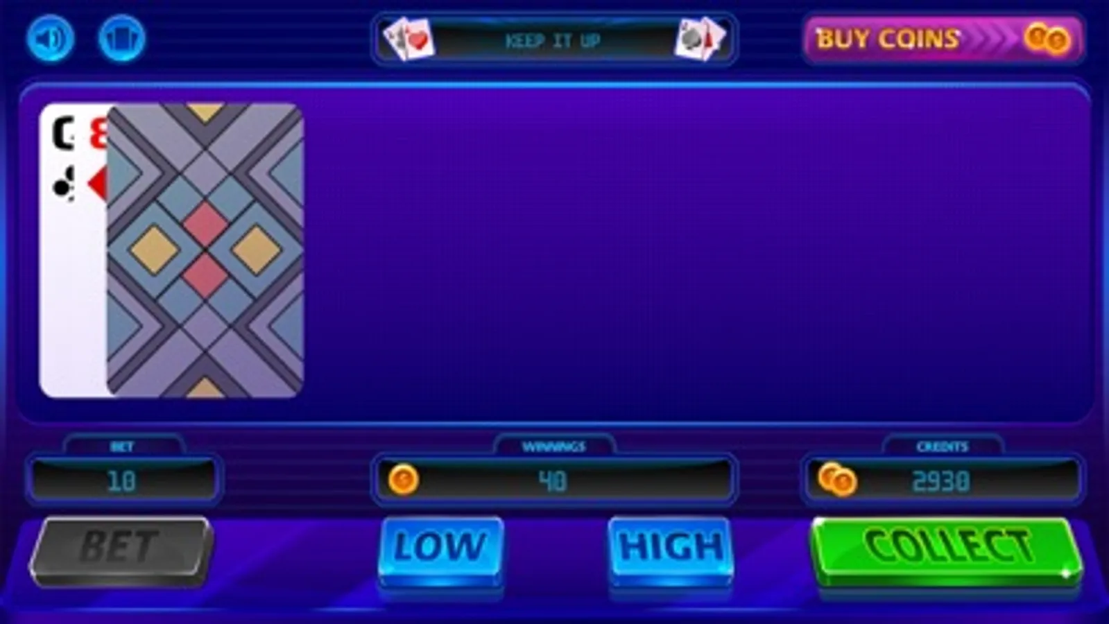 6, You can decide to just collect your winnings but why not double up? You can guess if the next card will be "low" or "high". If you guess right your winning will be doubled and you can guess again (or chicken out and collect your winnings)