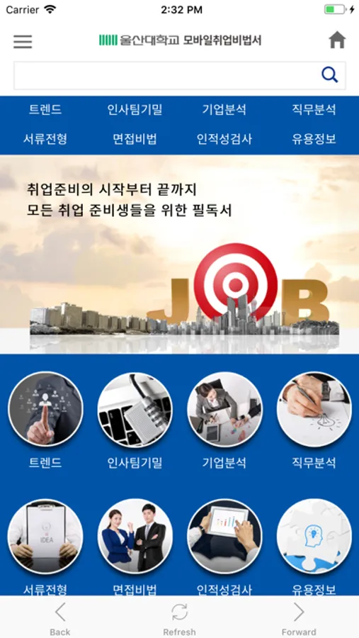 본 어플리케이션은 울산대학교 학생을 대상으로 다양한 취업 정보를 모바일로 제공함으로써 유용한 정보 제공과 편의성 증대를 위해 제작된 것으로 다음과 같은 콘텐츠를 제공하고 있습니다.
