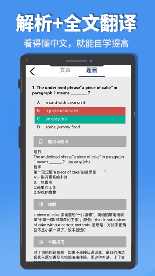 全文翻译、题干翻译、单题详解和技巧。看得懂中文,就能自学提高。
