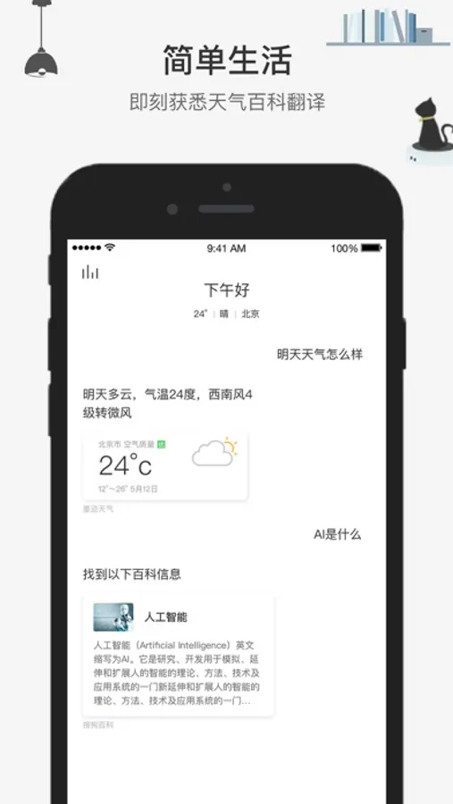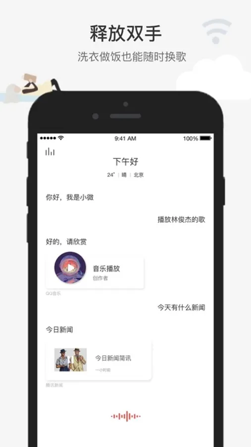 小微是全新设计的对话机器人,可以陪你聊天、放音乐、讲故事、查百科、看天气