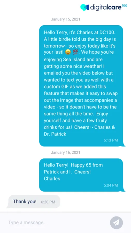 In addition to recording videos, users can communicate with customers via text messaging. The digitalcare100 app gives users the ability to send and receive text messages from their assigned DC100 phone number. This feature allows users to communicate with individuals, groups, or your entire client roster - directly from the app.