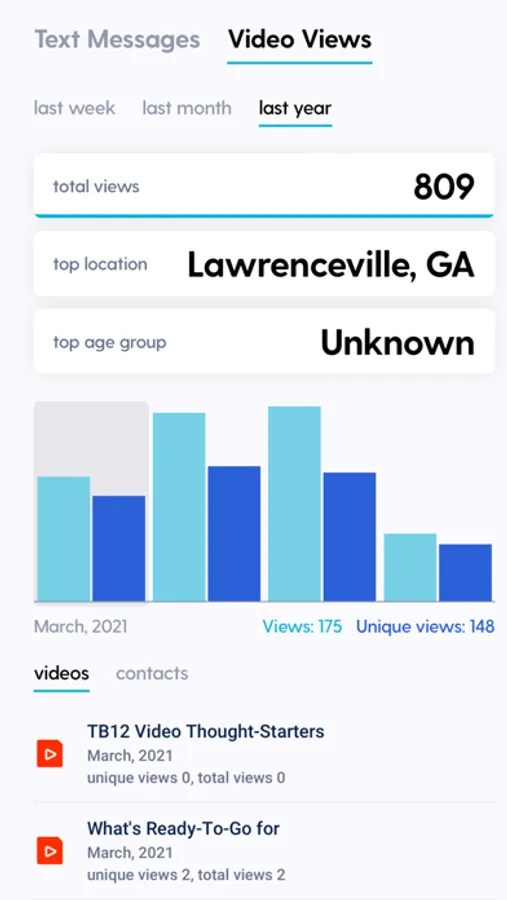 The digitalcare100 companion app includes access to video and text messaging statistics, including total video views, unique views, location views, and date views.