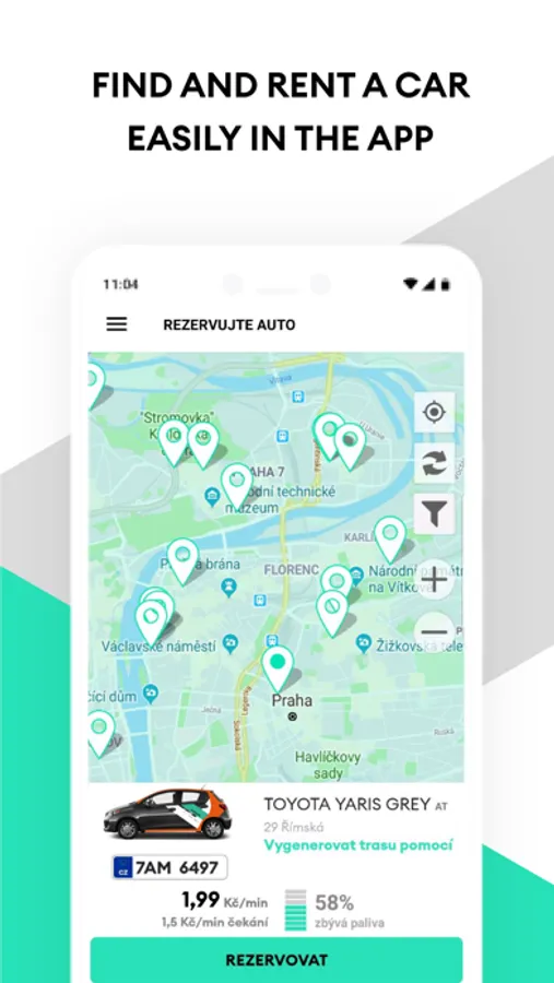 You find a nearby car on the map directly in the Anytime app and book it for 20 minutes for free. You unlock the car easily through the app and start the rent. You can park anywhere in Prague in accordance with traffic regulations, the only exceptions are underground parking lots and parking lots not accessible to the public. The complete price list can be found on our website.
