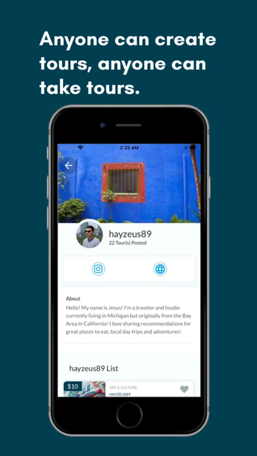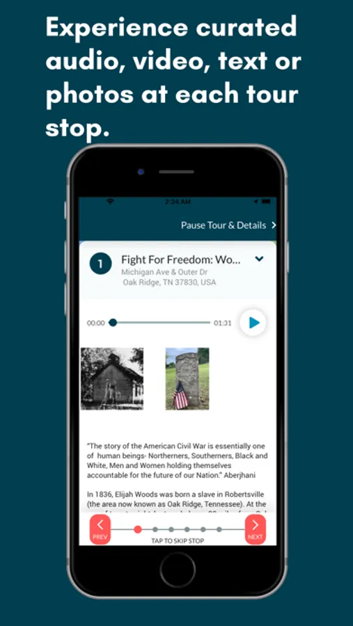 No need to plan ahead or break the bank—just open the app and see which tours are available around you. The app delivers all of the Tour Creators’ content to you. Simply start and pause your tour as you wish. See a great park along the way? Just pause your self-guided tour, and start your it again when you are ready.