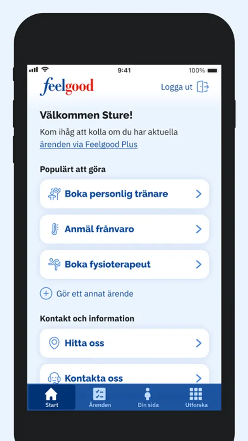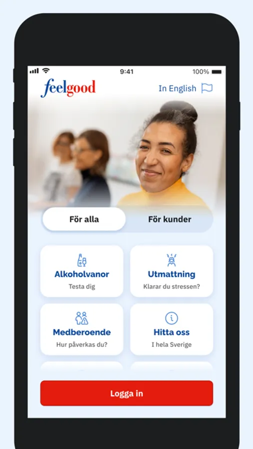 Feelgood-appens funktioner byggs ut kontinuerligt. Vissa delar finns tillgängliga för alla, och andra nås när din eller en anhörigs arbetsgivare har ett avtal med Feelgood.