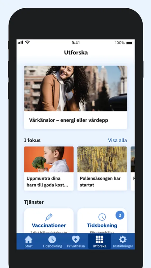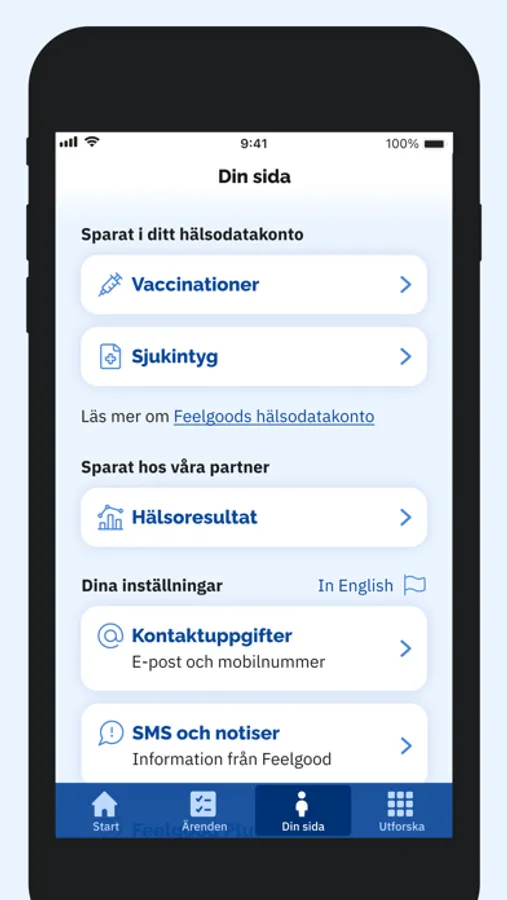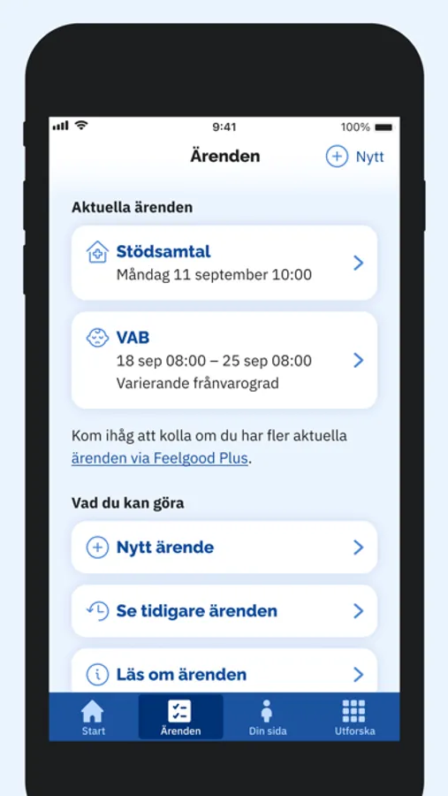 Du kan sjuk- och friskanmäla dig samt anmäla vård av barn (VAB) i appen dygnet runt. Din chef informeras automatiskt och du får tillgång till sjukvårdsrådgivning.