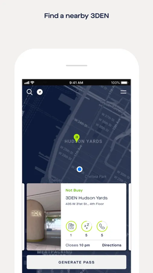 3DEN is multi-purpose pay as you use space packed with comforts and amenities to work, unwind and recharge. A place to go when you need a place to go. Comfy chairs, healthy snacks, and free coffee. Plenty of outlets to recharge your phone. Pristine bathrooms, private showers and nap pods to recharge yourself.
