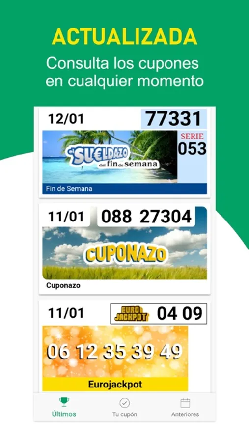 Es muy fácil obtener los resultados de los números con premio, con un diseño sencillo e intuitivo. ¡Conviértete en el más afortunado teniendo en tu mano todos los sorteos!