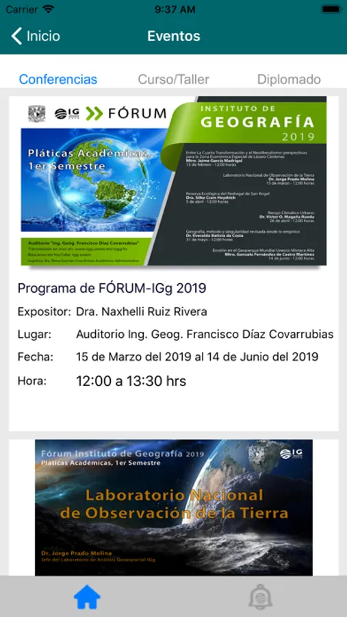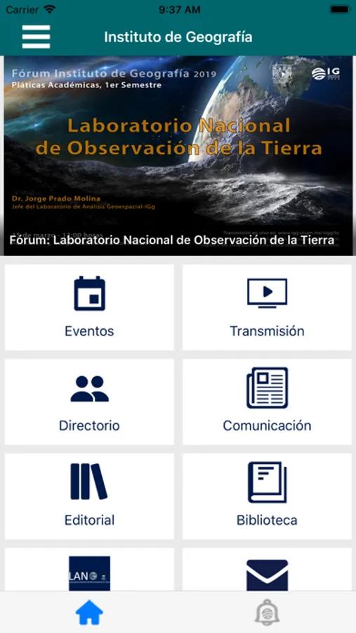 Aplicación del Instituto de Geografía en la cual podrás ver el Directorio, Próximos eventos, Streaming en Vivo en la propia aplicación o mediante otras plataformas, recibir notificaciones de eventos y avisos, consultar las convocatorias y resultados de la becas.