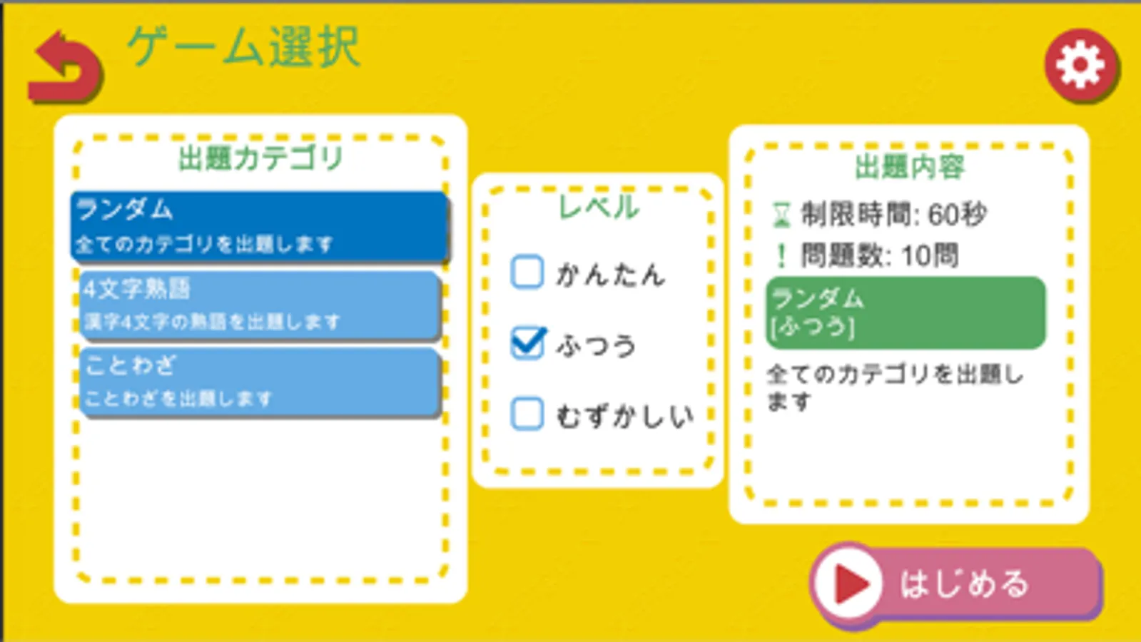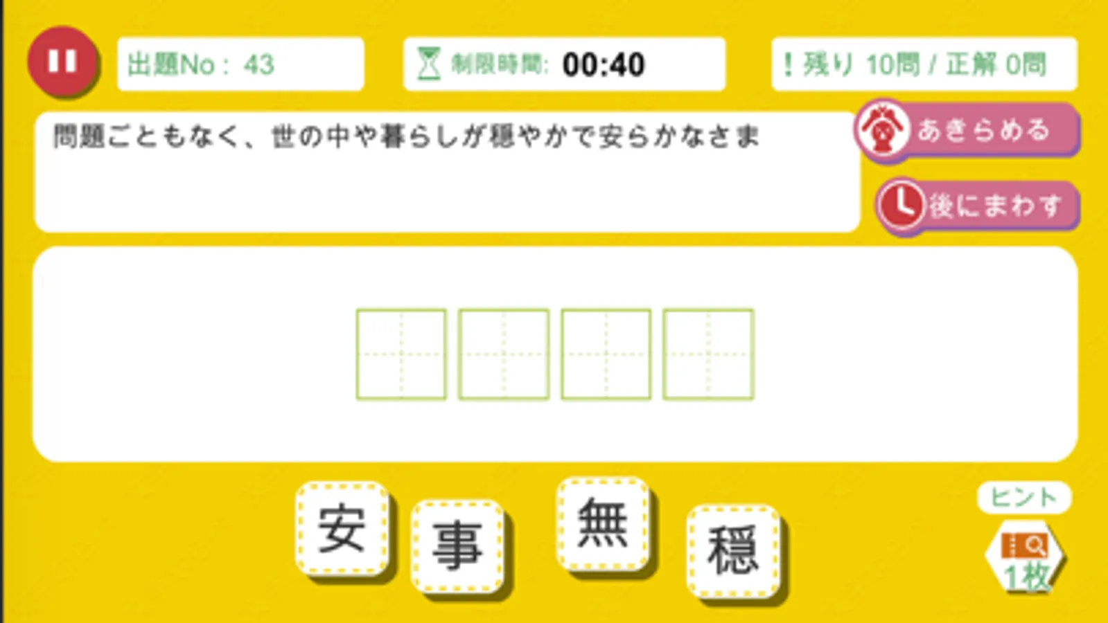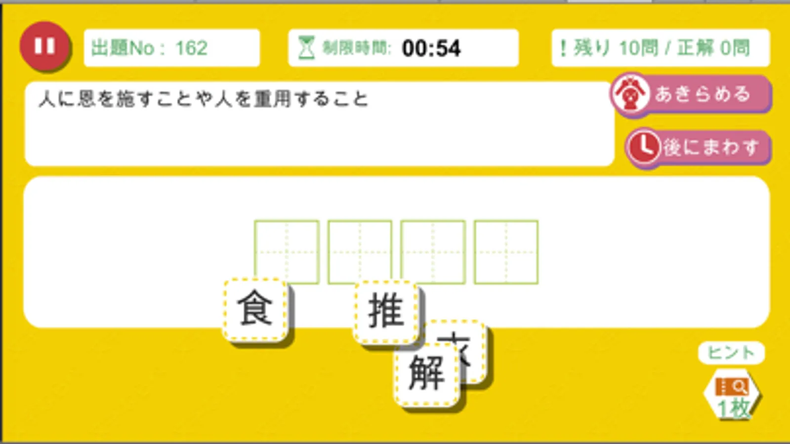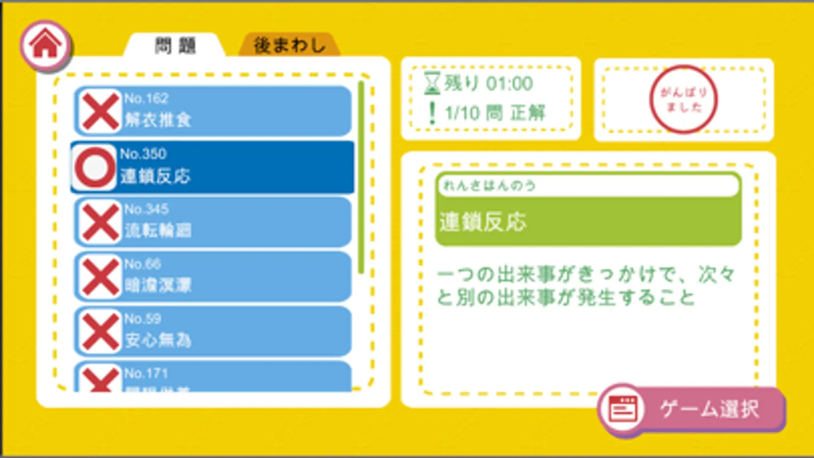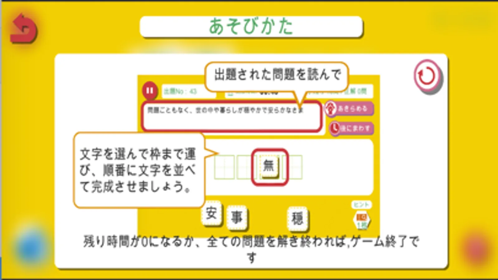 出題された質問と散らばった文字から単語を推理して、順番通りに枠に並べていきましょう。