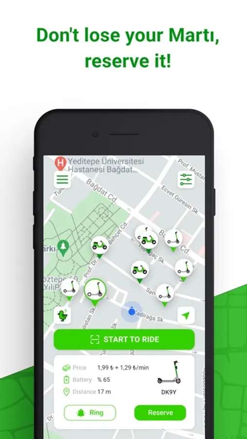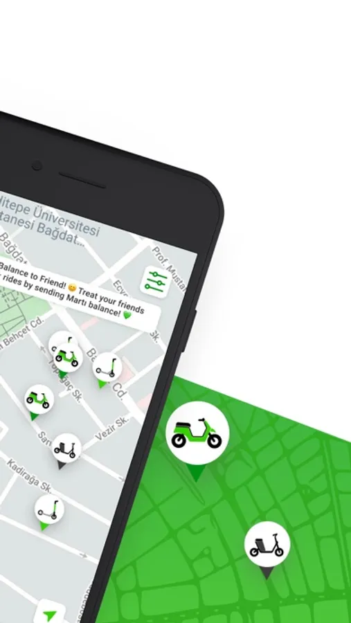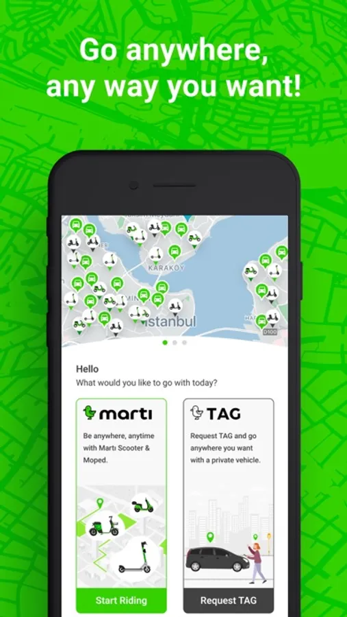 Martı is a transportation application that allows you to reach wherever you want, whenever you want. By requesting a vehicle under the TAG option in Martı, you can go wherever you want to go safely in the comfort of a private vehicle, and you can go to your destination you want to reach with an electric vehicle (scooter, mobilet, moped) in a fun, fast and environmentally friendly way.