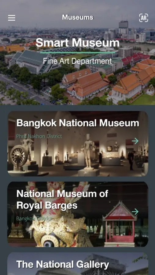 This is an application that improves National Museum touring experience to all who visit. Its content covers 4 main museums, namely, Bangkok National Museum, National Museum of Royal Barges, The National Gallery, and National Museum Silpa Bhirasri Memorial. With the aim of supporting multiple tourist nationalities, 4 Languages (English, Thai, Mandarin, Korean) are available for selection.