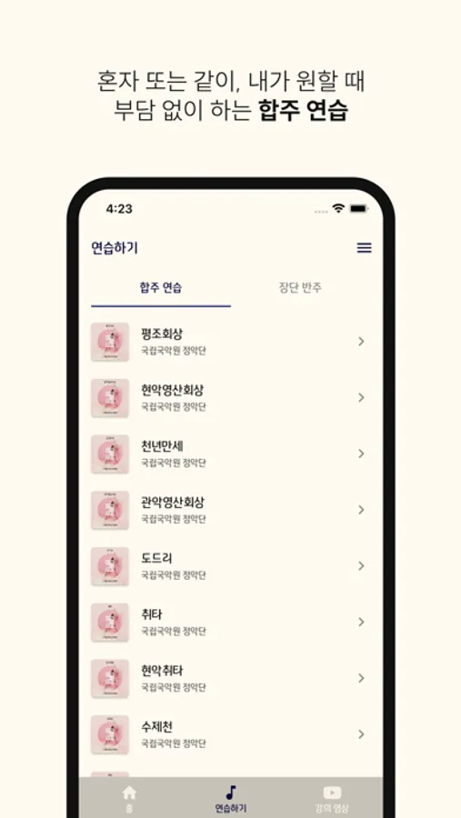 합주곡은 연주 악기를 선택할 수 있어서 전체 합주 연습은 물론, 합주를 연습해보고 싶은 악기와 단둘이 연습할 수도 있어요.