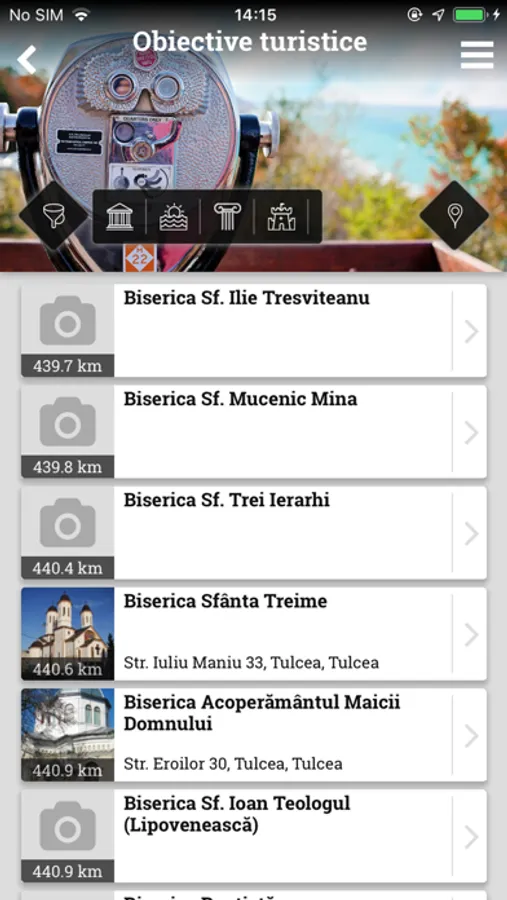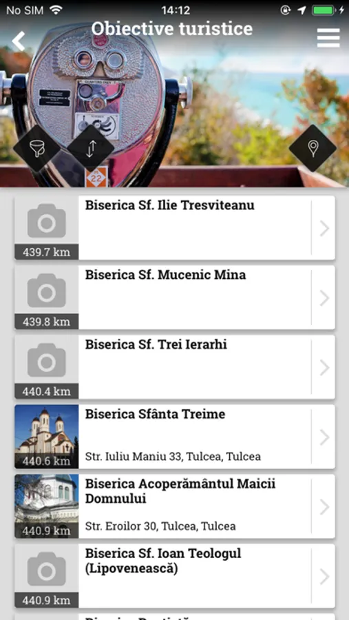 Toate elementele pot fi sortate alfabetic sau dupa distanta. De asemenea, se pot folosi optiuni de filtrare, in functie de tipul de punct de interes.
