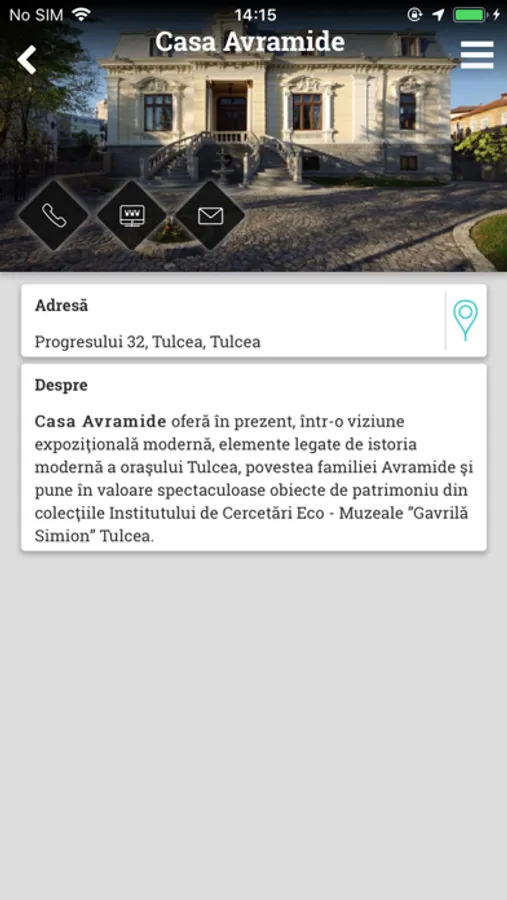 Toate punctele de interes contin detalii precum: imagini, text, adresa, telefon/telefon mobil cu posibilitatea de apelare directa, adresa de email cu posibilitatea de a trimite mesaj folosind functia email a telefonului, website, orar, locatie pe Google maps si optiuni de navigatie.
