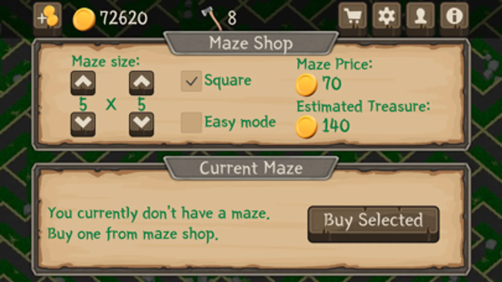 You can buy a maze of size you select, from maze shop with your golds. Bigger mazes cost more gold and are more difficult to solve, but pay more gold as well, when they are solved.
