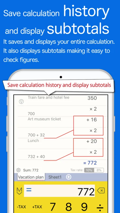 Calculator+α saves your past calculations in a list, allowing you to review them anytime.