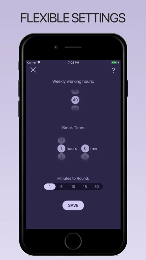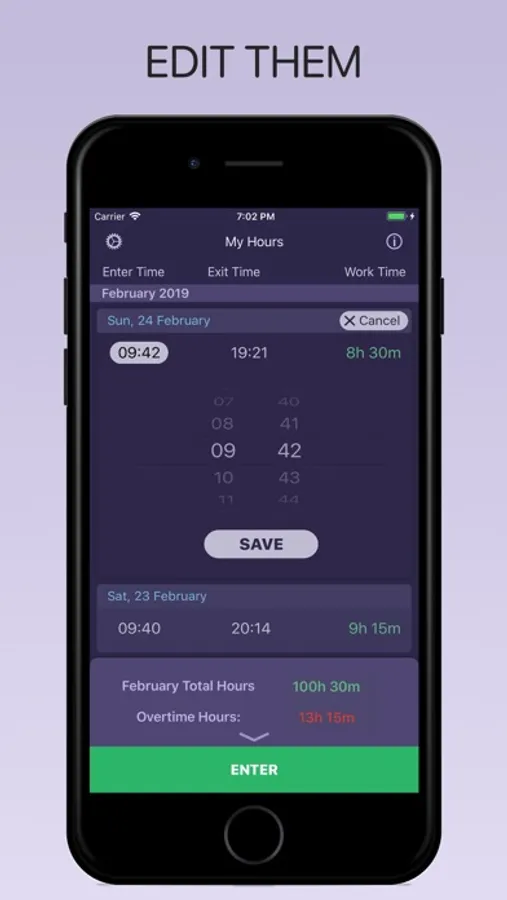 Simply tap "Enter" and go to work, the app will automatically calculate your breaks, and finally "Exit".