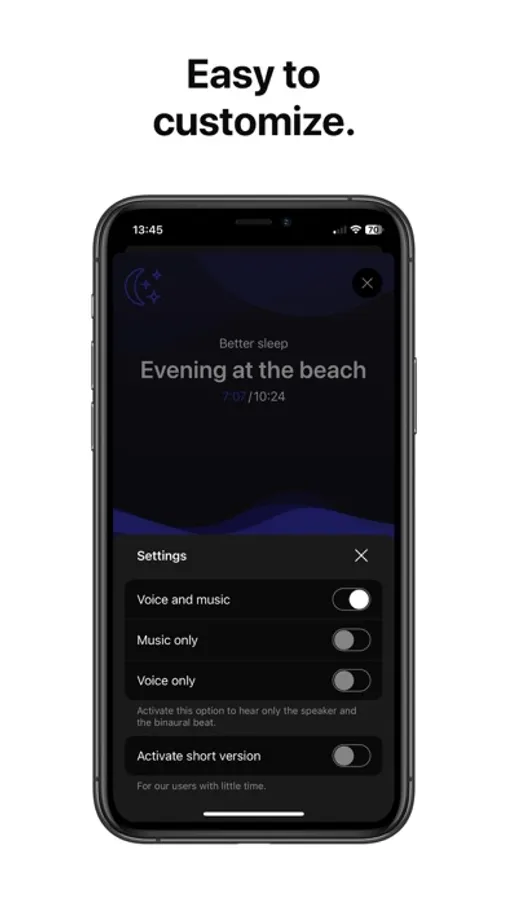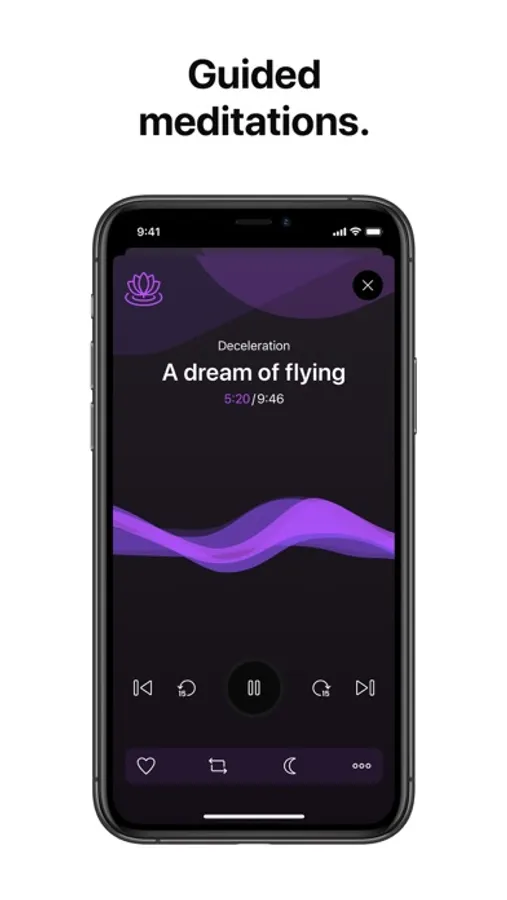 • Sleep Timer: Binaural beats and soft music for a healthy sleep. The meditation switches itself off after you fall asleep