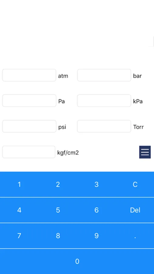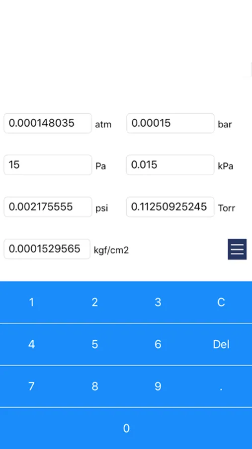 This app is a unit converter of pressure. Convert from atm, bar, Pa, kPa, psi, Torr, mgf / cm2 to other units.