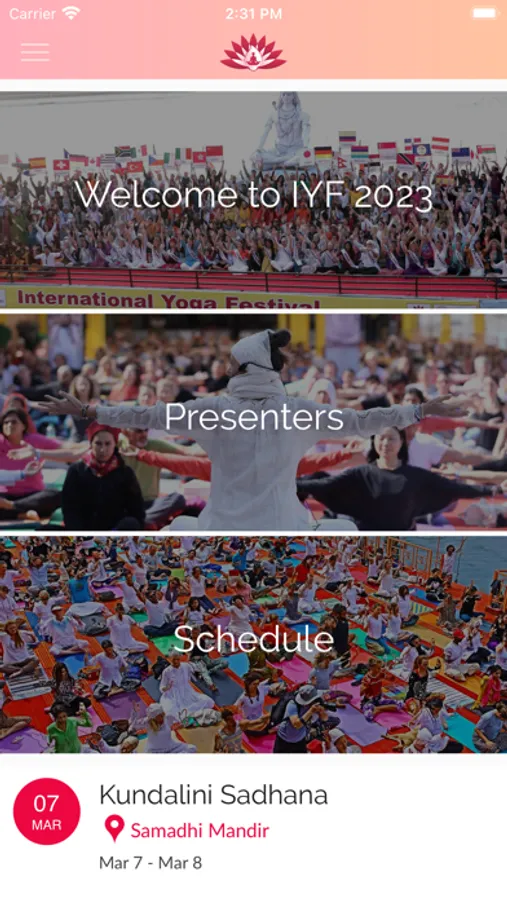 International Yoga Festival's official app to view the festival's schedule, presenters, and more! Read more about the presenters at IYF, view the day-to-day schedule of this year's festival, read about IYF's partners and charitable organizations it supports, and engage with IYF on its Facebook, Instagram, and Twitter!