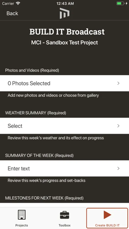 Employees will use the application to communicate with key project stakeholders weekly by allowing them to create broadcasts to share project progress. BUILD IT will allow clients to track the weekly progress of their projects with a gallery of images from project beginning to end.