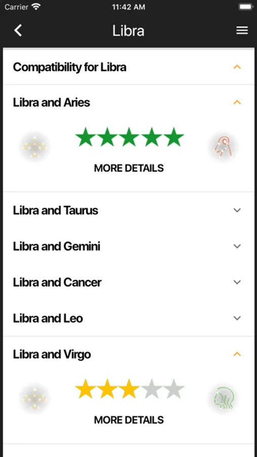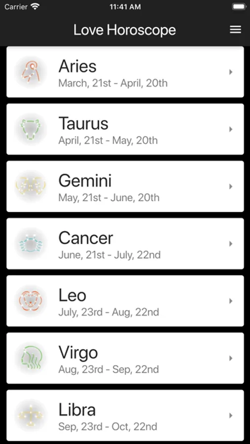 • Main characteristics of all the zodiac signs, including element, planet, opposite zodiac sign, colors, gemstone, and daily lucky numbers.