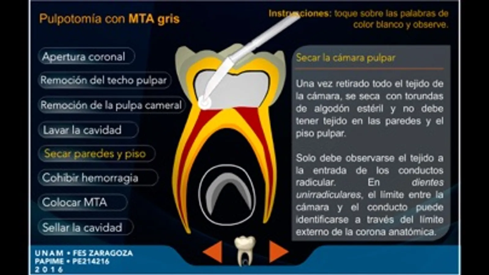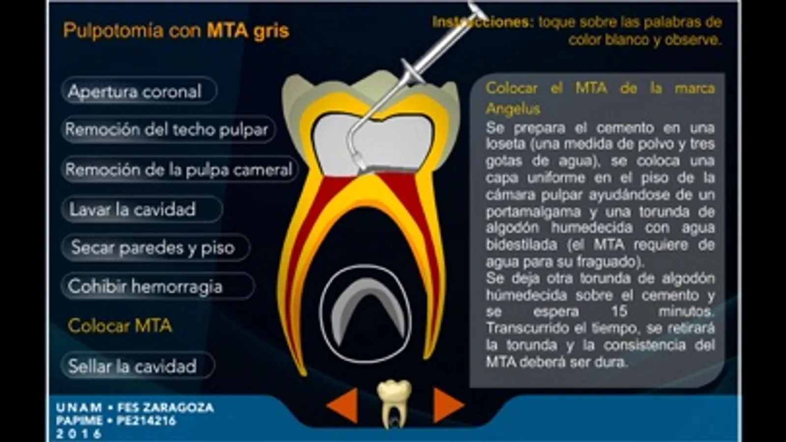 Material de apoyo para entender la técnica odontológica llamada “Pulpotomía”, que es un procedimiento clínico que se realiza con frecuencia en la población infantil. Tiene como objetivo mantener la vitalidad del tejido pulpar que se encuentra en los conductos radiculares.