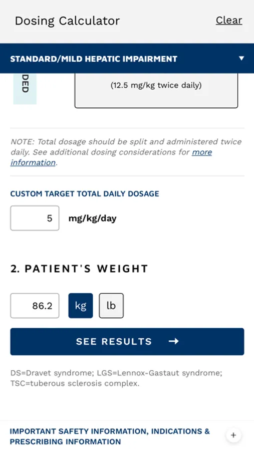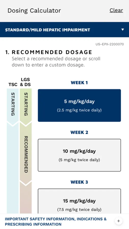 Calculate your patient’s EPIDIOLEX® (cannabidiol) dosing. This calculator allows you to select a recommended or custom dosage and allows you to enter your patient’s weight. Based on these inputs, the calculator will provide an output of the recommended daily dosage. Additionally, dosing in patients with hepatic impairment can be calculated by first selecting the level of hepatic impairment for more accurate dosing calculations. Results will be provided in total daily and twice daily dosage recommendations. A simple dosage results document can then be generated and provided to your patient or their caregiver for reference.