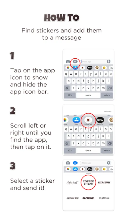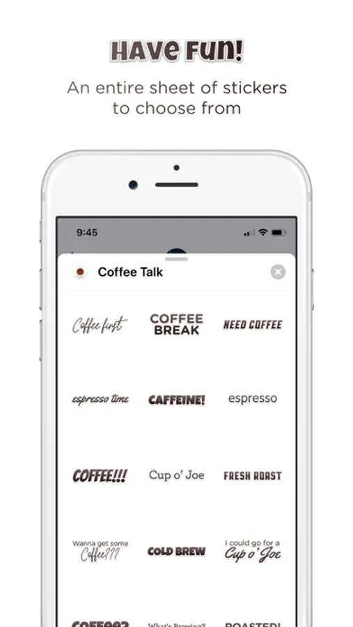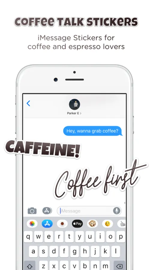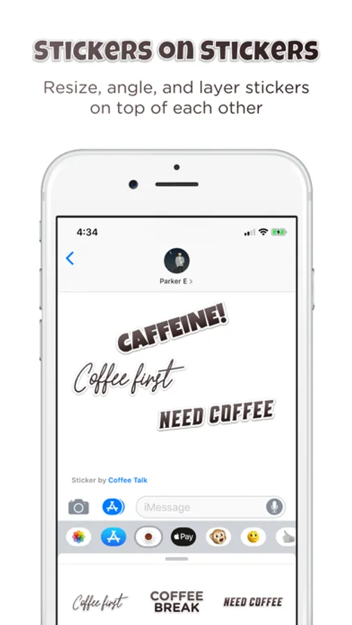 Share stickers with anyone. Keep the conversation going with your love of coffee. Tap on a sticker to add it to a conversation or tap and hold on a sticker to drag it on top of other stickers or iMessage bubbles.
