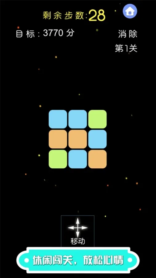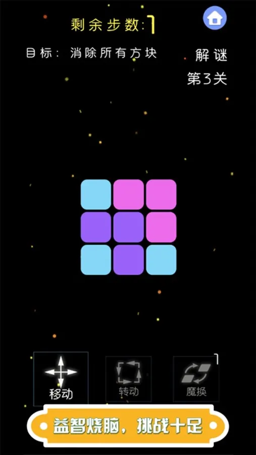 通过移动、转动操作,使横向、竖向或斜向方块一致即可完成消除。
