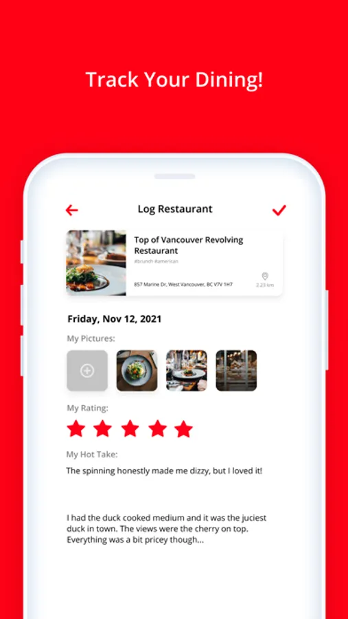 - Keep track of restaurant completion and dish completion, compare with your friends to see who has truly been around!