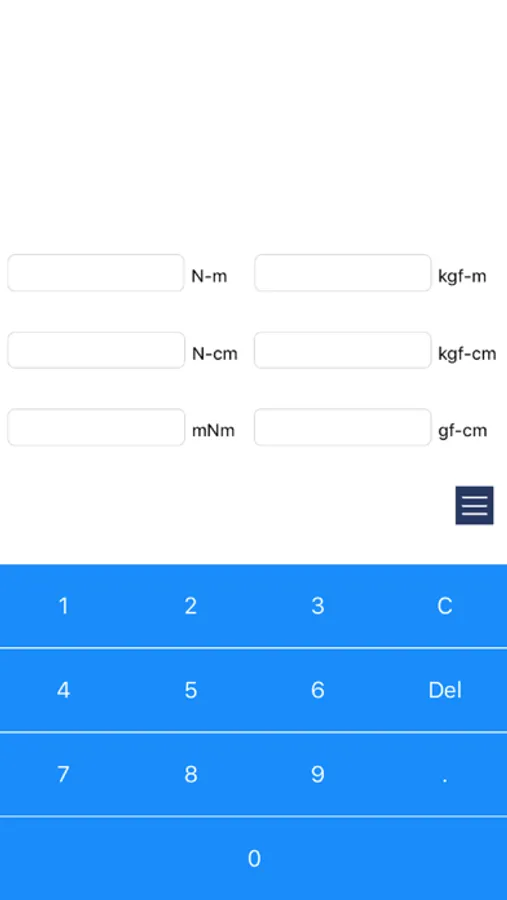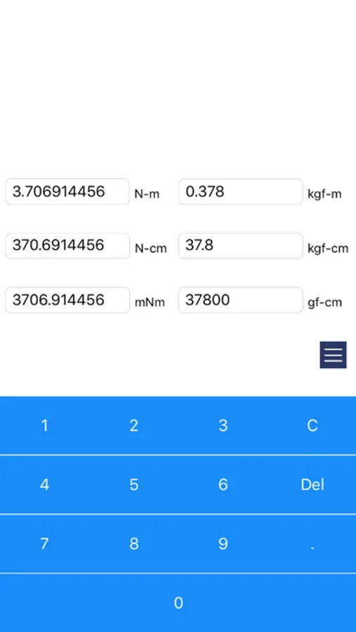 This app converts units of torque. Convert from N-m, N-cm, mNm, kgf-m, kgf-cm, gf-cm to another unit.