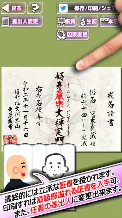 戒名を自動生成するだけでなく、戒名授与証書も発行・印刷でき、位牌としても利用可能です。