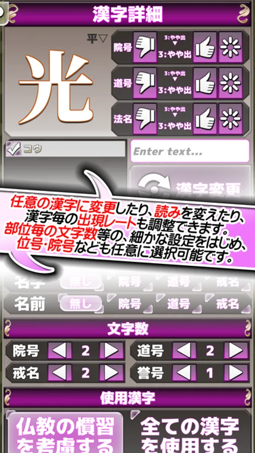 ・院号、道号、戒名、誉号などの字数を自由に変更可能な為、変則的な戒名も生成可能。