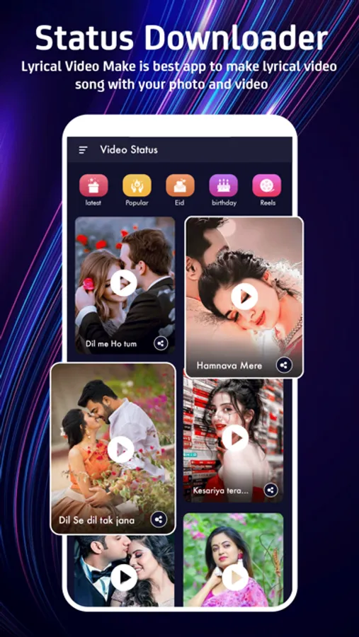 provided Different types of video status category like Love Video Status,Birthday video maker