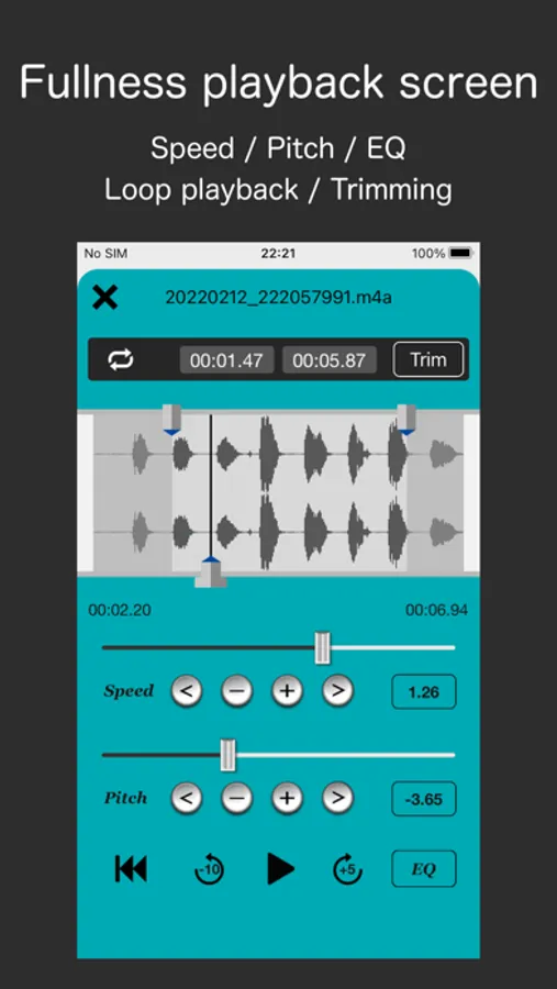 - Supports trimming the recording file. (Reflects speed / pitch and EQ value.)