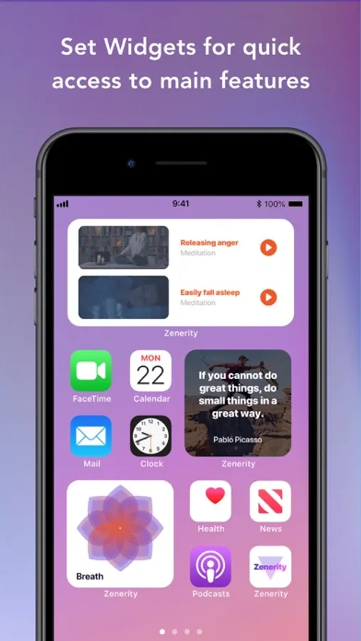 Set widgets and access quickly daily meditations, guided programs or breathing exercises. Woke up with an inspiring quote on set widget.