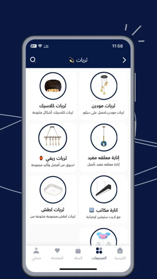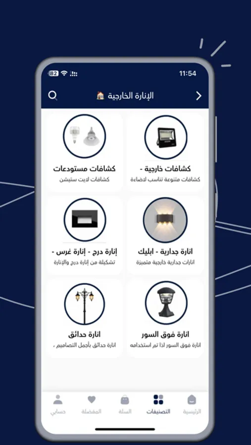 سبوت لايت - ثريات - إنارة معلقة - إنارة جدارية - مودرن وكلاسيك - إنارة تراثية - إضاءة موجهه - إضاءة ذكية - إنارة مسار مغناطيسي - إنارة مخفية - أبليك خارجي - إنارة حدائق -إنارة غرس - كشافات طاقة شمسية - مفاتيح وأفياش