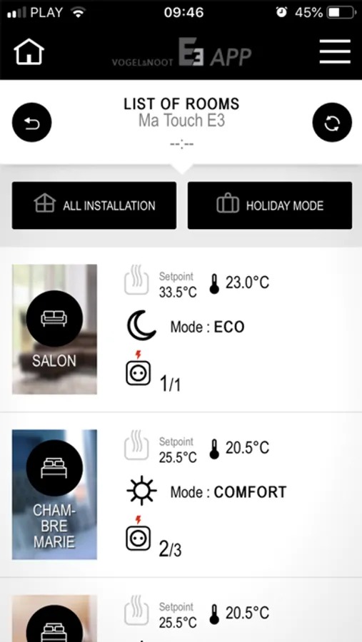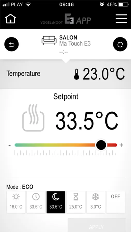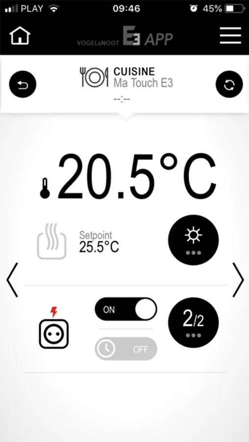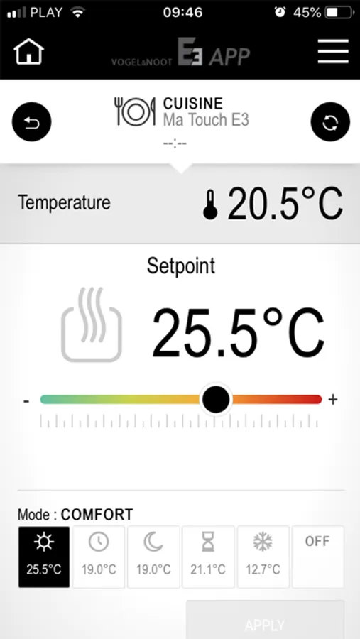 The Control E3 App allows you to remotely monitor and control your VOGEL&NOOT, MYSON and FINIMETAL heating system. Just connect your smartphone or tablet (WiFi) to your CONTROL E3 wireless central programmer. You can then easily change modes and corresponding temperatures, create and change day and week programs, set holiday dates for all connected appliances, rooms or zones. Improve your comfort while saving energy. The Control E3 App supports a wide range of our product portfolio. It is now also connectable to our under floor heating systems.