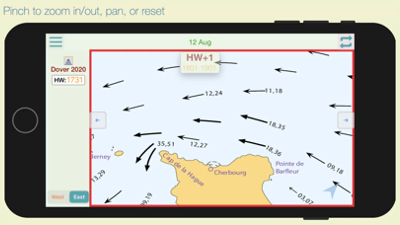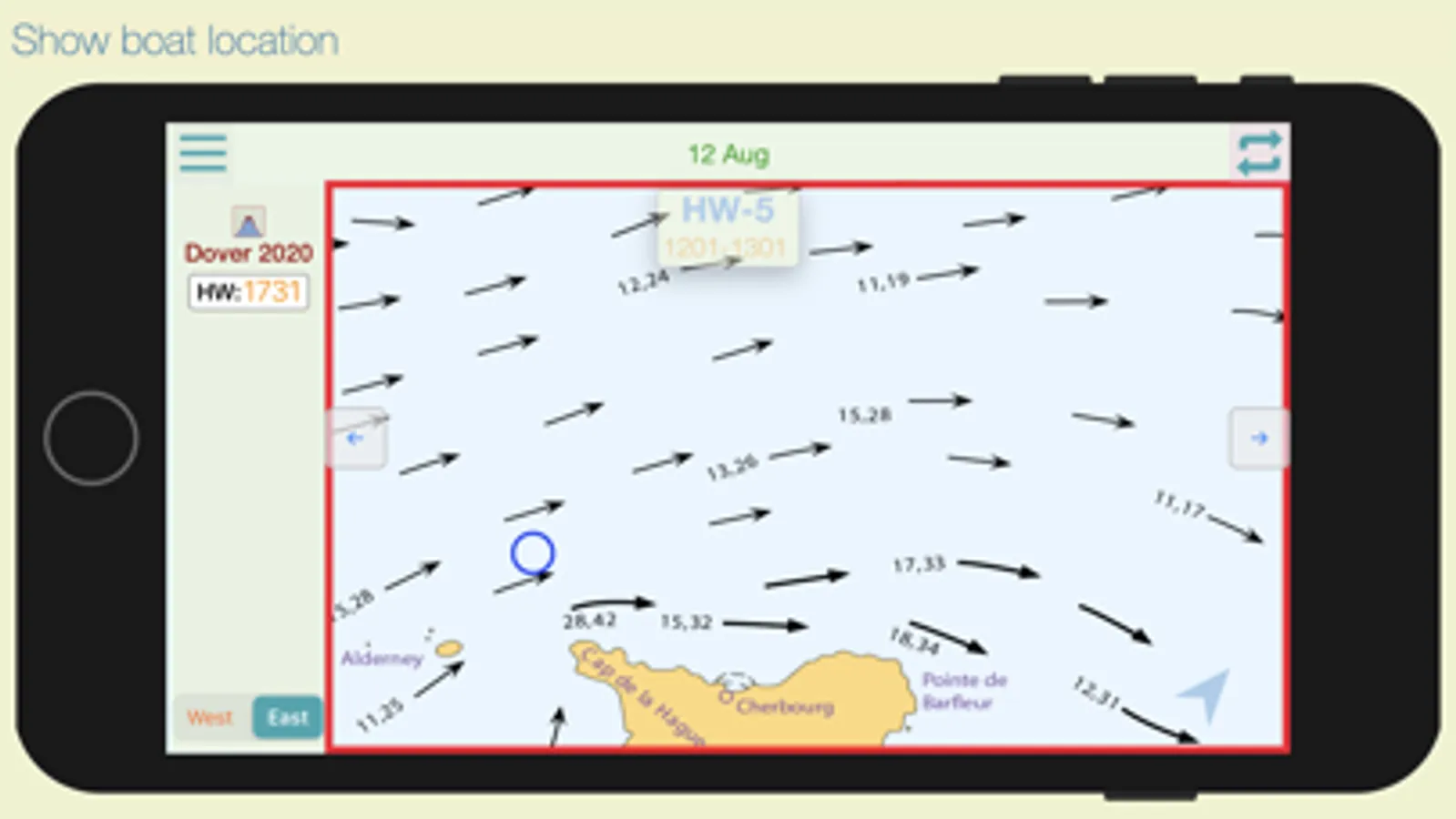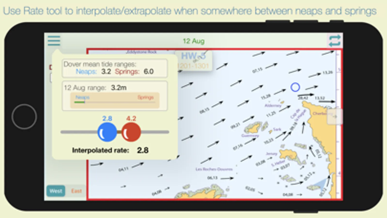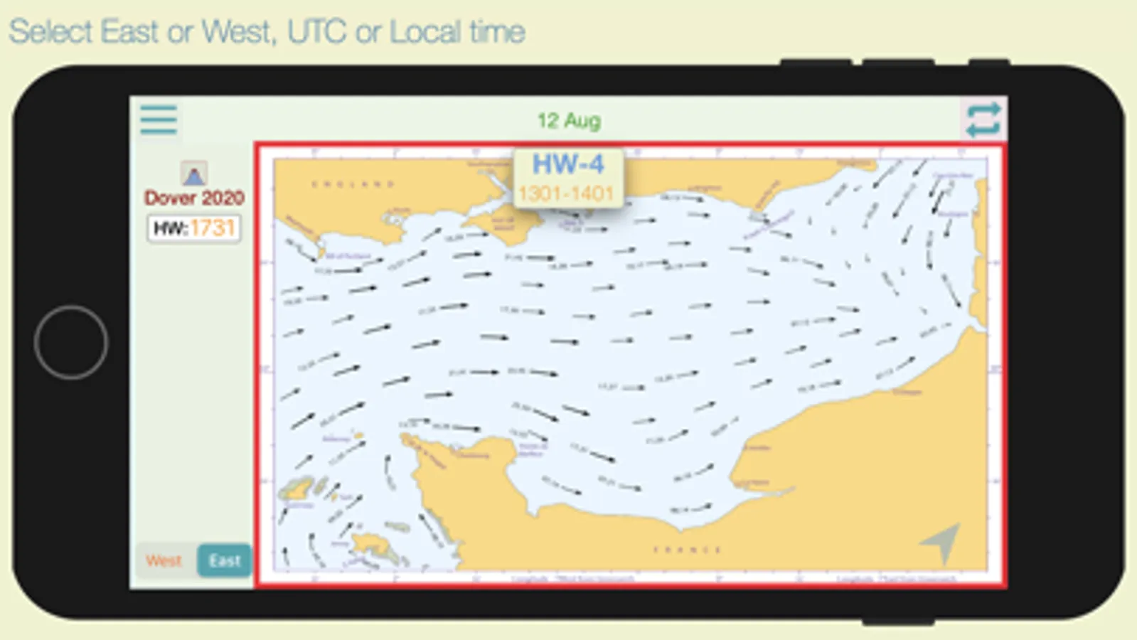 The app automatically selects the nearest Dover HW time of the day, but if you want to see data for the next or previous HW of the day, swipe forward or back to advance the tidal hour.